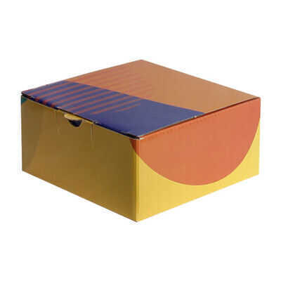 13,5*13,5*6,5cm (Boy*En*Yükseklik) Desenli selefonlu kilitli kutu E dalga ofset baskılı E dalga oluklu mukavvadan üretilmiştir.Desenli turuncu, lacivert ve sarı renkler yoğunluktadır.Muhtelif ürünlerin paketlenmesi için kullanılmaktadır.